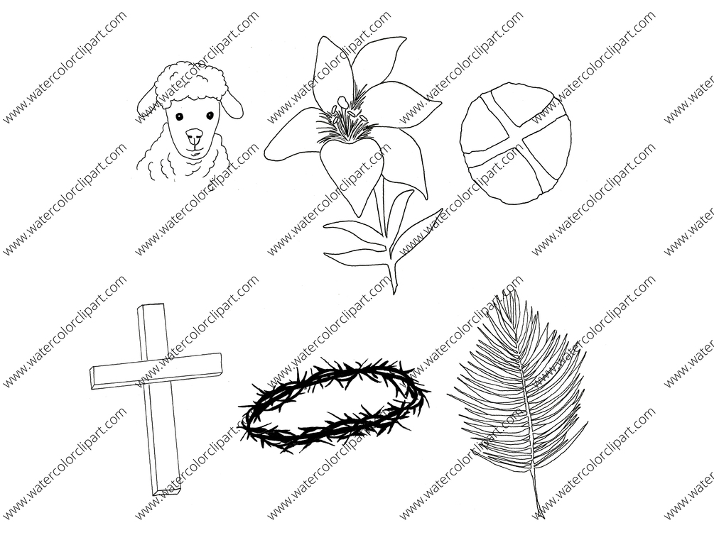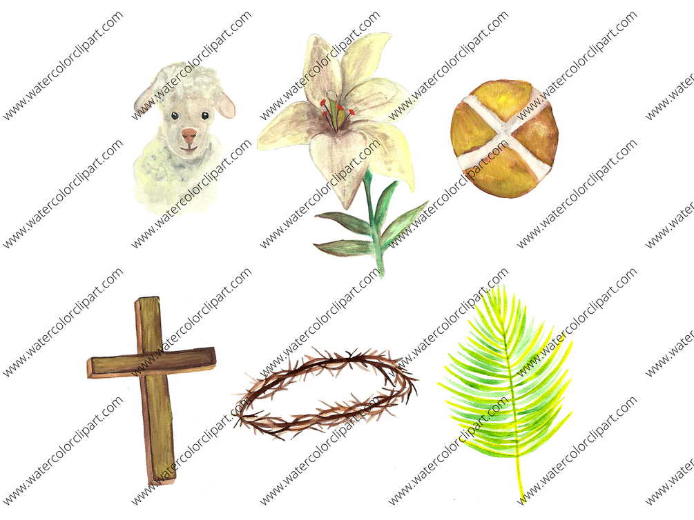 This listing is for a hand painted watercolor Easter Day Clipart set. Elements include an Easter palm for Palm Sunday, a hot cross bun drawing, an Easter Cross, an Easter Lily image, a crown of thorns png, and an Easter Lamb symbol.