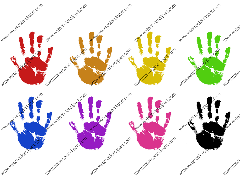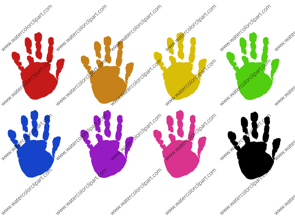 — One (1) ZIP file with THIRTY-TWO (32) hand painted watercolor child kid’s handprints clip art pieces in 8 colors.