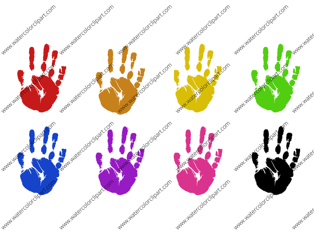— One (1) ZIP file with THIRTY-TWO (32) hand painted watercolor child kid’s handprints clip art pieces in 8 colors.
