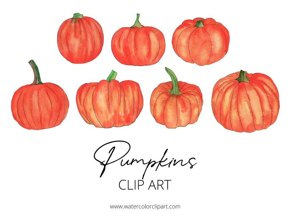 — One (1) ZIP file with SEVEN (7) handpainted Halloween pumpkin clip art pieces